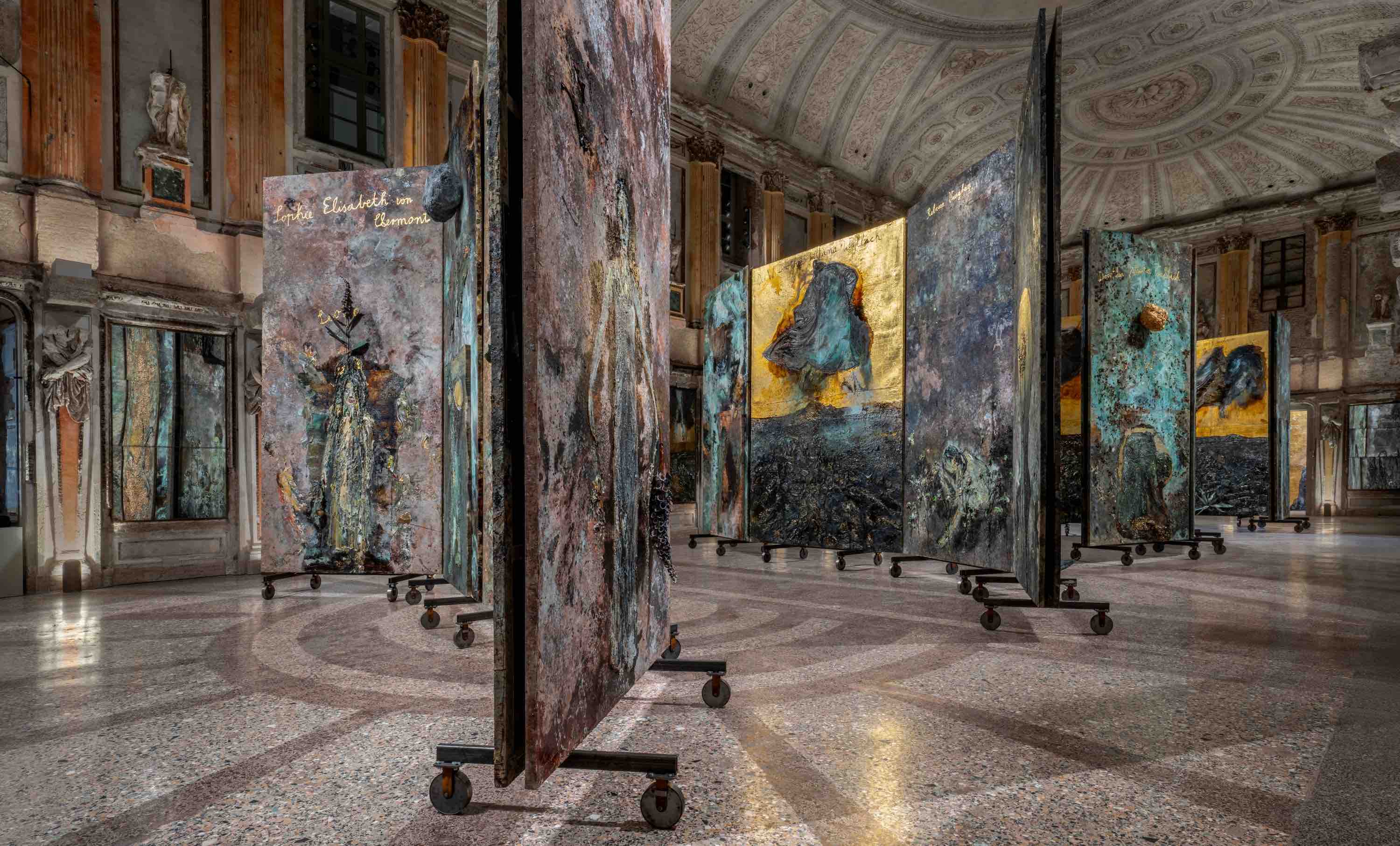 The works engage with the hall's historic architecture, creating an immersive experience in which matter, history and imagination merge into a single visual journey.